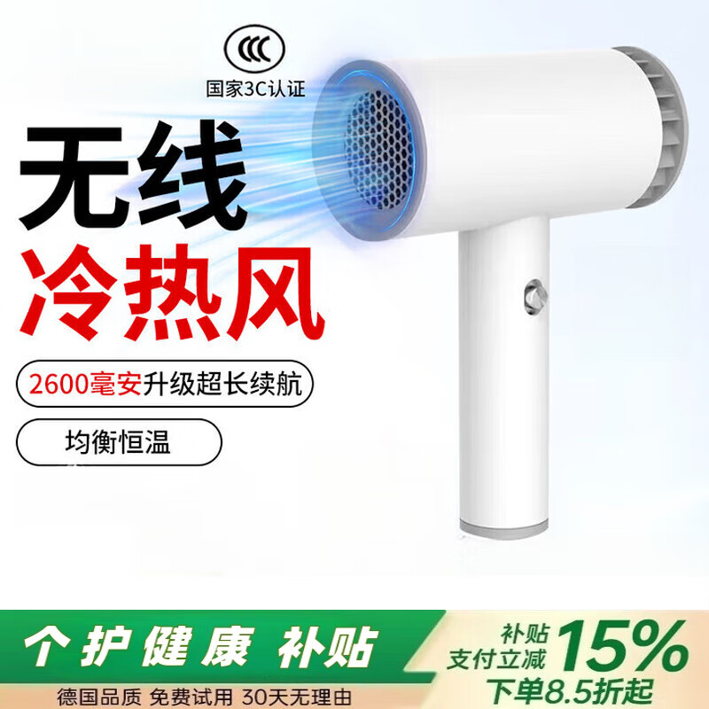 戴森德乐电吹风机充电款无线便携小功率不伤发学生宿舍无绳冷热风速干美术艺考专用超长续航静音高速吹风筒 白色无底座(充电冷风+插电热风) 智能控温+过温保护