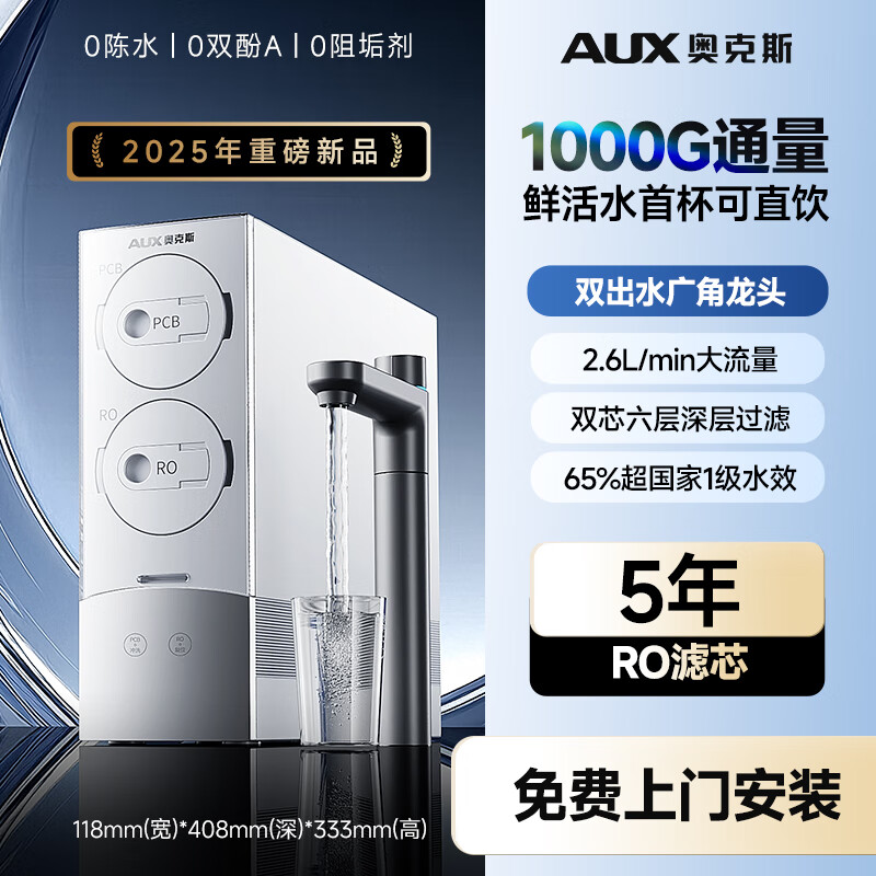 奥克斯(AUX)家用净饮水机鲜活水RO反渗透1000G厨下直饮净水器过滤器 1000G净水器 【5年长效RO膜】 即热制冷型