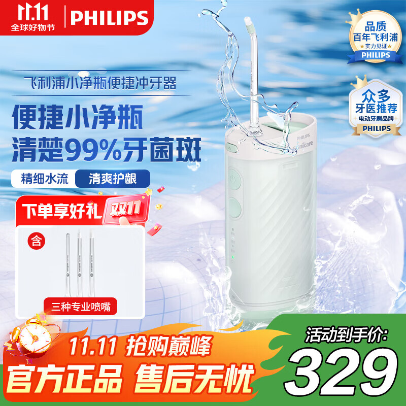 飞利浦(PHILIPS)便携式冲牙器HX3331 家用洗牙器 电动水牙线3档调节 牙齿清洁器情侣款 送女友/男友 中秋礼品 HX3331/02不焦绿 3支喷头
