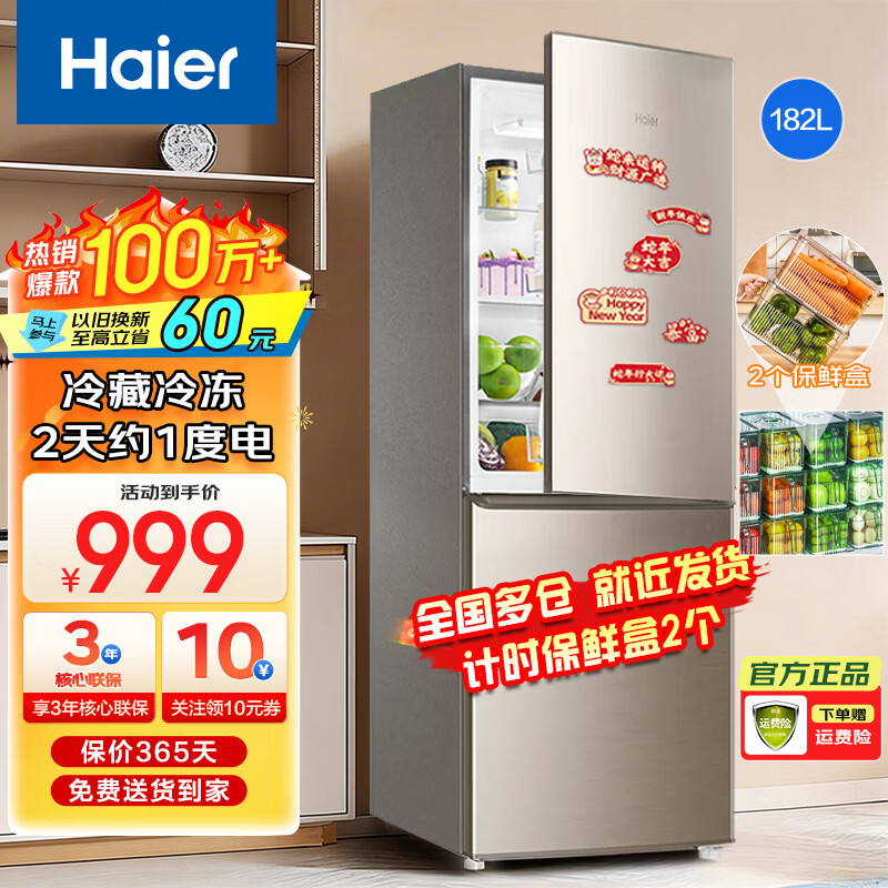 海尔(Haier)冰箱双开门风冷无霜/直冷小型家用小冰箱双门二门电冰箱一新等级能效净味保鲜以旧换新家电补贴 182升双门行业爆款冰箱+2个计时保鲜盒