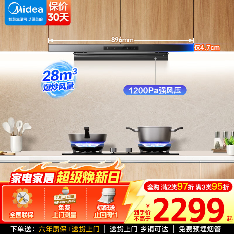 美的(Midea)【新款式超薄A5/A8】抽吸排油烟机家用 25/28风量超大吸力 欧式顶吸烟机智能APP 烟灶联动自清洁 A8【超薄系列】单烟机-玄武灰