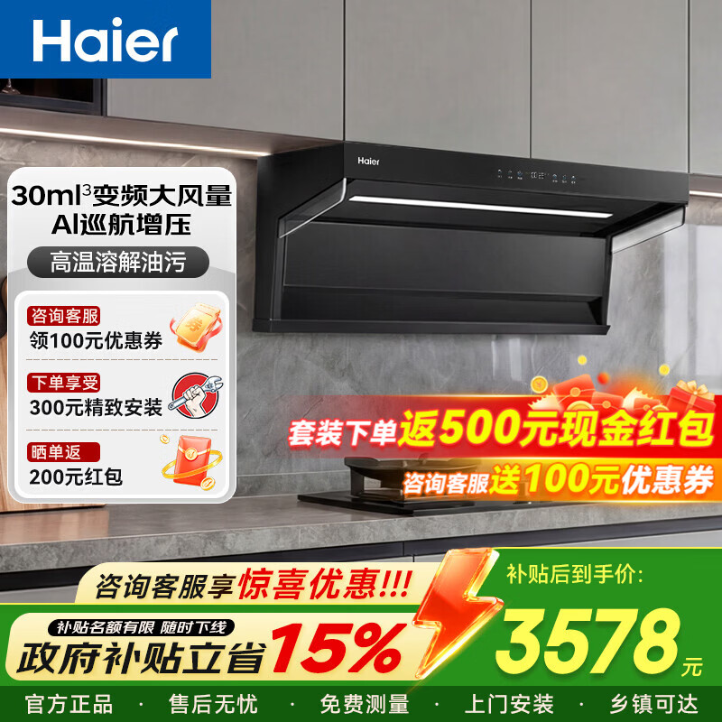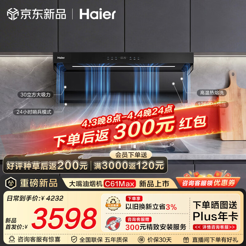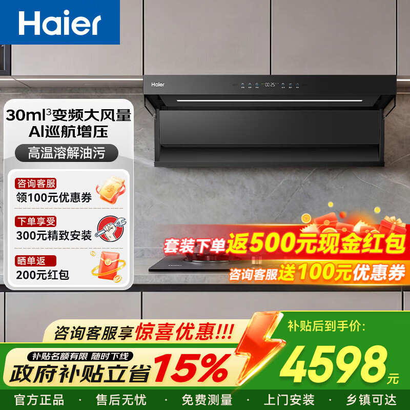 海尔(Haier)抽吸排油烟机C61MAX 顶侧双吸家用30风量大吸力热熔洗 上门安装以旧换新 搭67%热效油烟机灶具套装