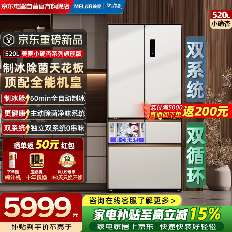 美菱小确杏机皇520L法式多门双系统自动制冰一级能效风冷无霜超薄嵌入家用冰箱BCD-520WFPU9CIZX