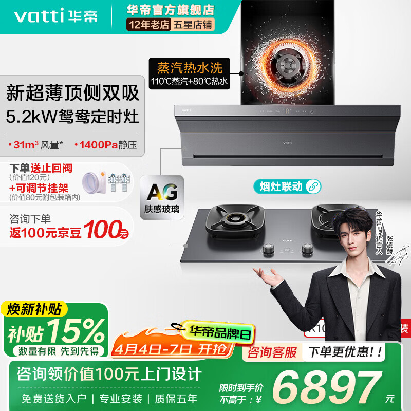 华帝(VATTI)K10烟灶套装【新超薄小飞翼机王】顶侧双吸自动蒸汽热水洗31立方大吸力AG肤感玻璃烟机灶具联动 【定时联动鸳鸯灶套装】K10+512S燃气灶