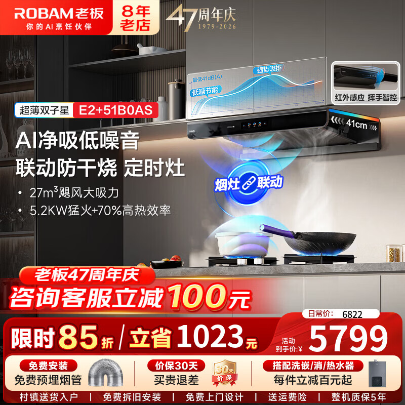 老板(Robam)油烟机烟灶套装【双子星E2机皇】欧式变频27风量1320Pa挥手智控吸油烟机燃气灶具套装 【联动定时防干烧】E2+51B0AS