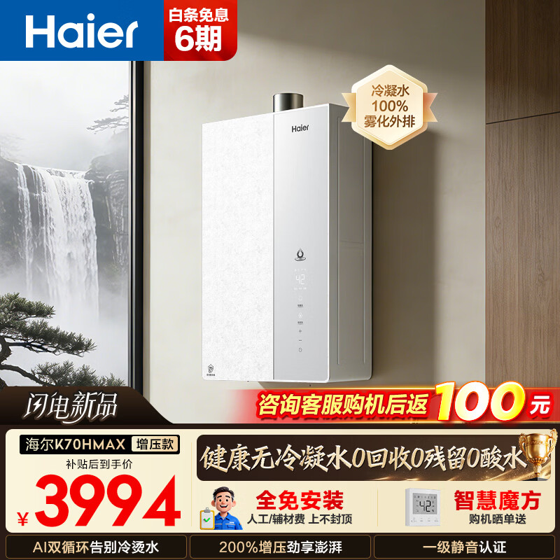 海尔(Haier)燃气热水器【麦浪K70Smax/K70SGT】超一级能效无冷凝水管离心雾化冷凝水100%外排节能更优惠 16L 下置风机【K70Hmax】无冷凝水增压