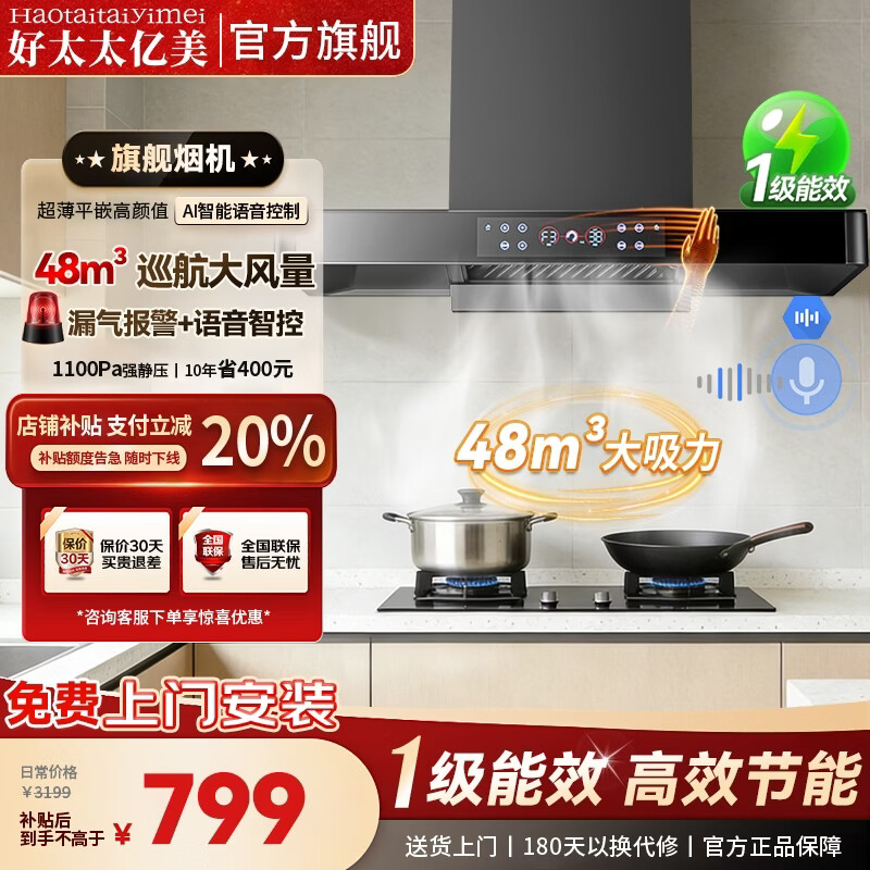 好太太亿美油烟机顶吸式抽油烟机家用变频一级节能欧式厨房大吸力小型免拆洗智能体感油烟机 彩屏【旗舰款】90宽48m³丨智能语音+漏气报警