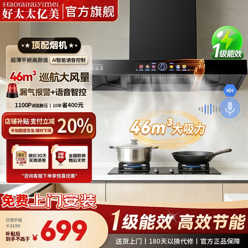 好太太亿美油烟机顶吸式抽油烟机家用变频一级节能欧式厨房大吸力小型免拆洗智能体感油烟机 彩屏【顶配款】90宽46m³丨智能语音+漏气报警