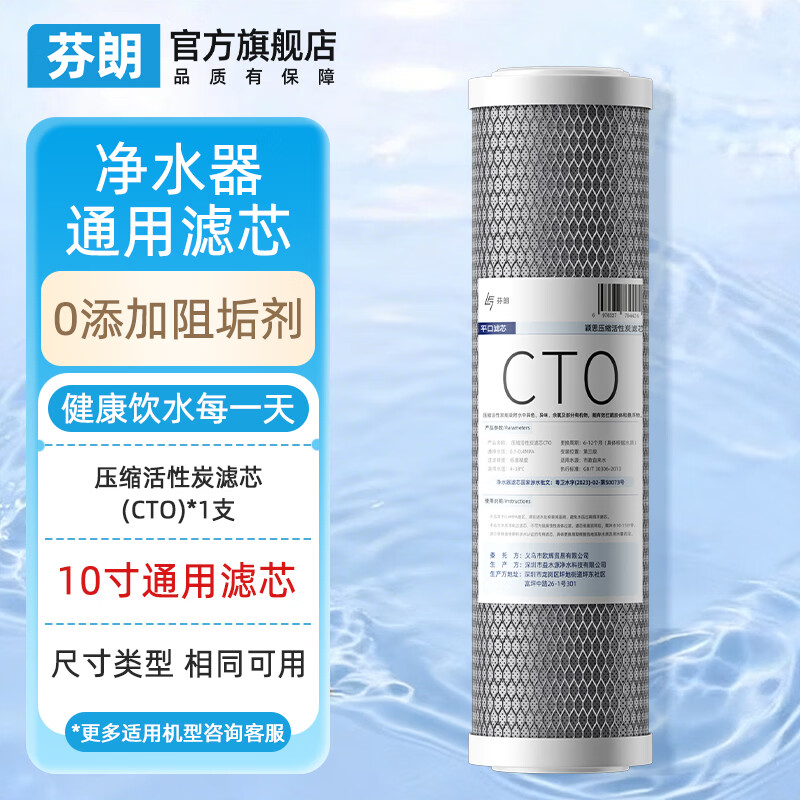 芬朗净水器滤芯10寸通用五级PP棉100G反渗透RO膜前后置活性炭滤芯CTO/T33家用过滤器纯水机UDF配件 【10寸通用】平口压缩活性炭滤芯(CTO)*1支
