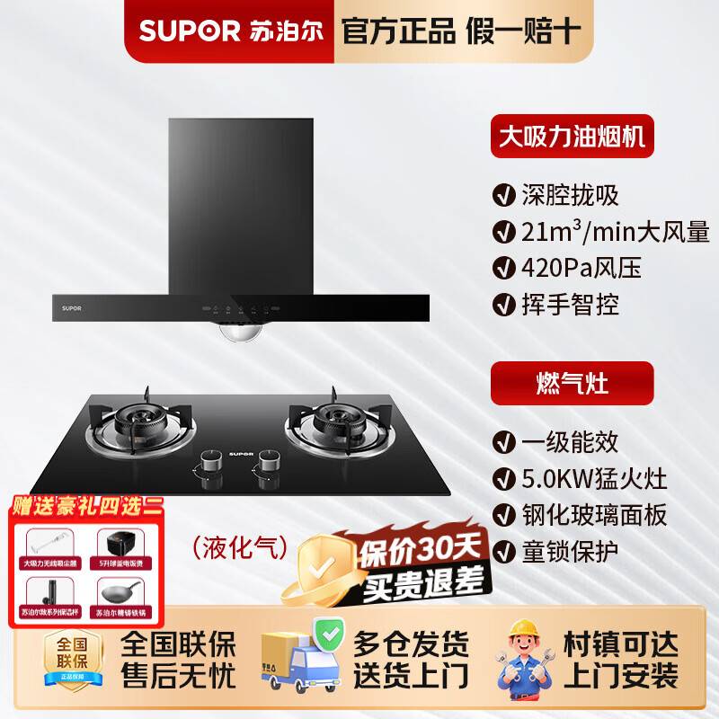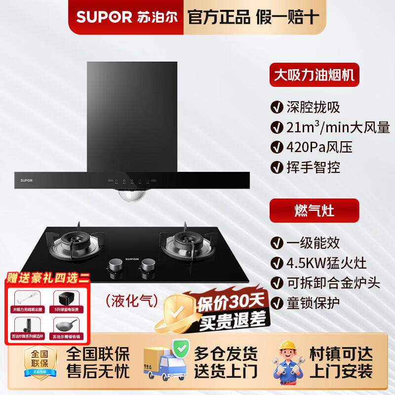 苏泊尔油烟机灶具套装家用大吸力抽烟机燃气灶具一级能效厨房烟灶套装 【家用套餐优选】搭配4.5KW蓝焰猛火灶(液化气)
