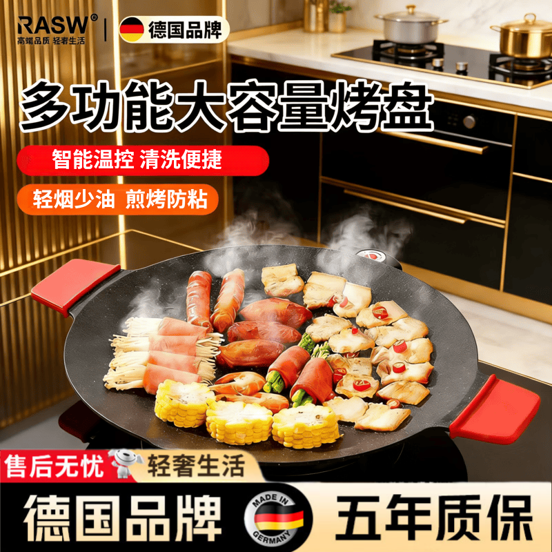 RASW德国电烤盘家用烤肉盘无烟不粘多功能大功率烤锅麦饭石圆形2-8人用电烧烤炉韩式多用途烧烤神器 40CM 麦饭石电烤盘【5-10人】 1层