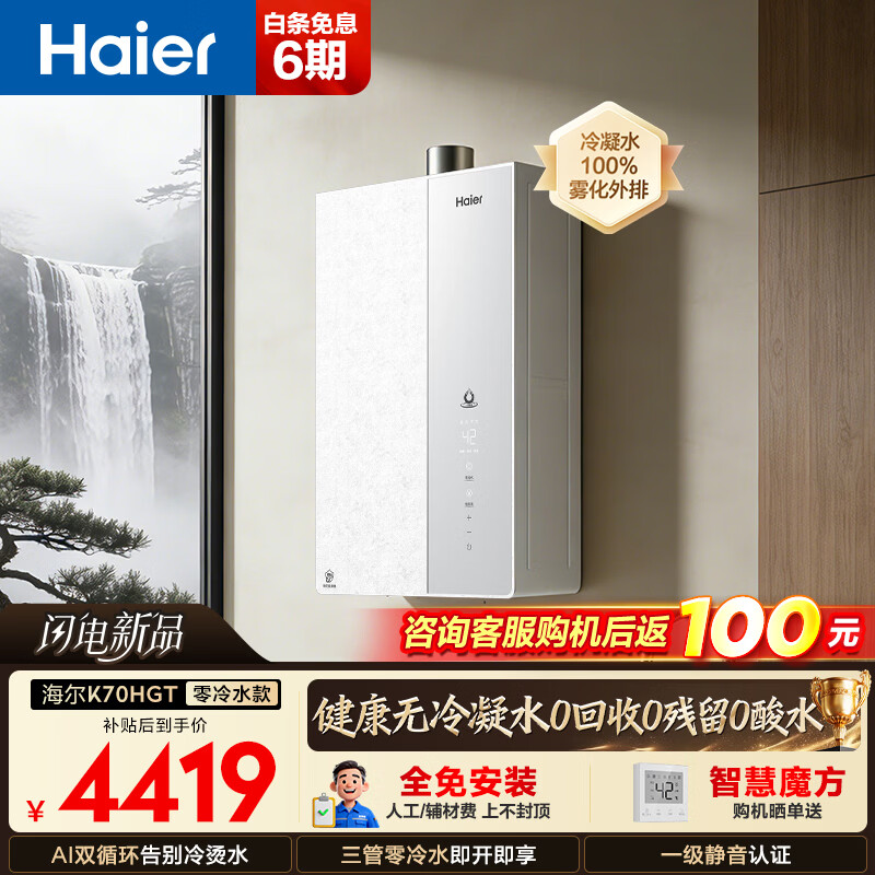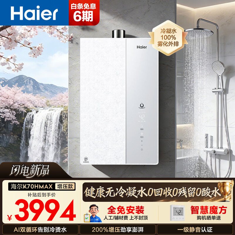 海尔(Haier)燃气热水器【麦浪K70Smax/K70SGT】超一级能效无冷凝水管离心雾化冷凝水100%外排节能更优惠 16L 下置风机【K70HGT】无冷凝水零冷水