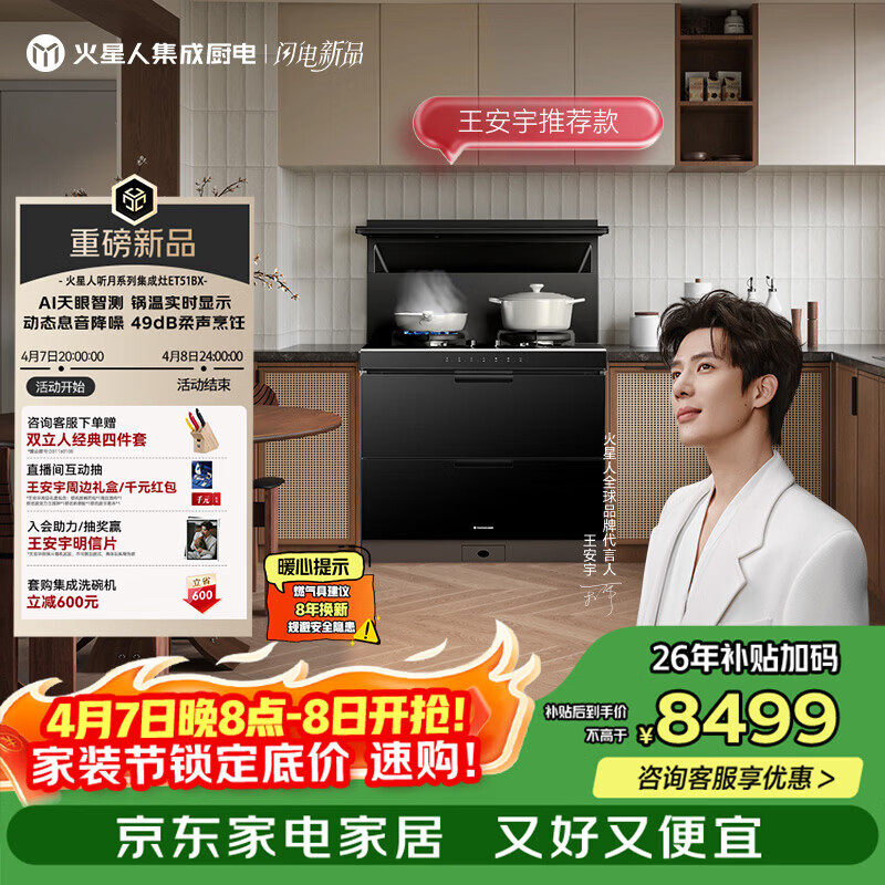 火星人【王安宇推荐款】ET51听月系列二星级消毒柜 变频28风量 液化气左排烟 燃气灶 一体式集成灶