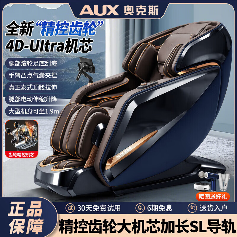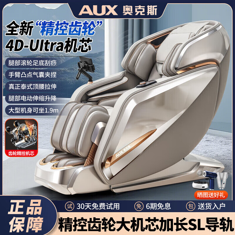 奥克斯(AUX)2025新款按摩椅家用全身4D大型多功能太空舱豪华全自动 银泽金Ultra-4D泰式顶腰拉伸+电动伸缩升降
