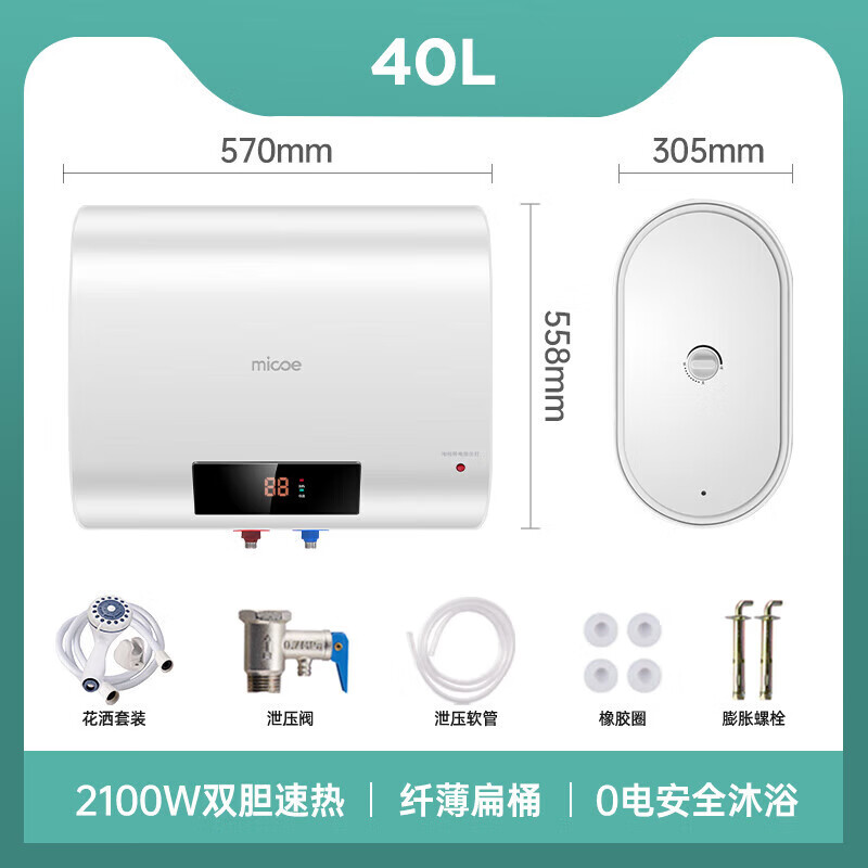 四季沐歌(MICOE)电热水器储水式家用50L速热超薄双胆扁桶卫生间洗澡40L60 BH1【40】 机械旋钮+LED数显+内置隔电墙