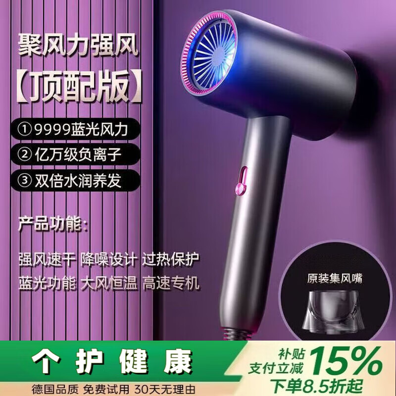 戴森德乐吹风机大功率不伤发负离子恒温冷热交替吹风筒家用大功率速干护发宿舍学生便携式冷热电吹风 灰色蓝光护发-无噪音2300w1.5米线 降噪设计+过热保护+蓝光功能+大风恒温