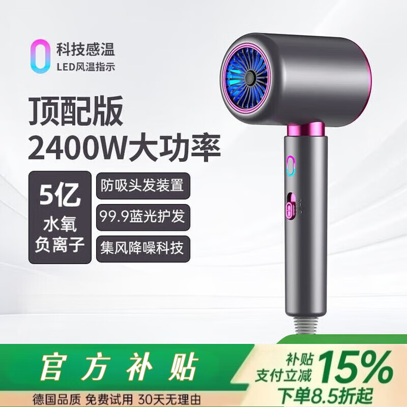 戴森德乐高速吹风机护发静音速干不伤发大功率速干负离子 长发专用电吹风2400W大功率 尊贵版-2400W-2W转-3亿香薰离子-灰色 防吸头发装置+99.9蓝光护发