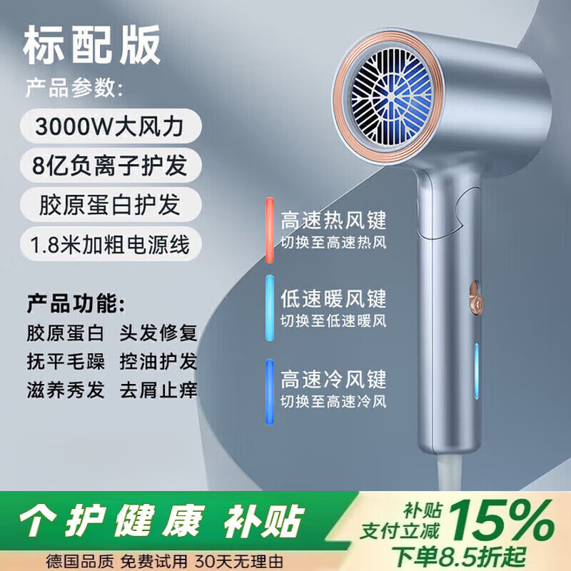 戴森德乐吹风机家用蓝光负离子护发宿舍用学生专用可折叠大风力静音小功率直风筒 徕芬银-3000w-5亿负离子护发试 胶原蛋白护发+三档智能感温