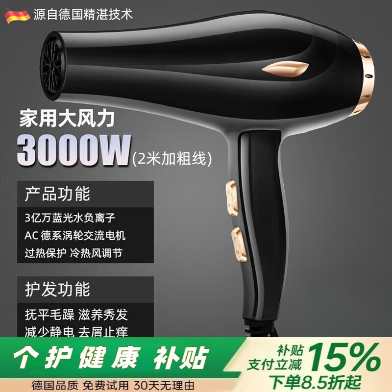 戴森德乐吹风机理发店专用发廊专用大风力静音电吹风机家用理发店大功率负子不伤发3800W速干冷热风 黑色3000-AC交流纯铜大电机-2.0米线 低音+降噪+护发