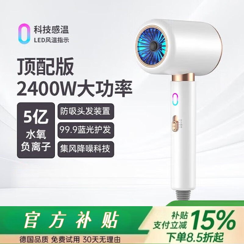 戴森德乐高速吹风机护发静音速干不伤发大功率速干负离子 长发专用电吹风2400W大功率 尊贵版-2400W-2W转-3亿香薰离子-白色 防吸头发装置+99.9蓝光护发