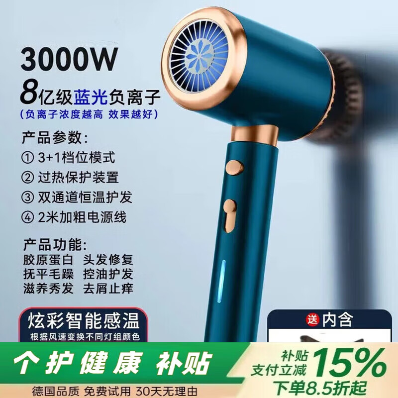 戴森德乐吹风机家用宿舍静音负离子大功率不伤发3000W高速风筒发廊大风力发廊理发店 蓝色-1600W 蓝光负离子+胶原蛋白+抚平毛躁