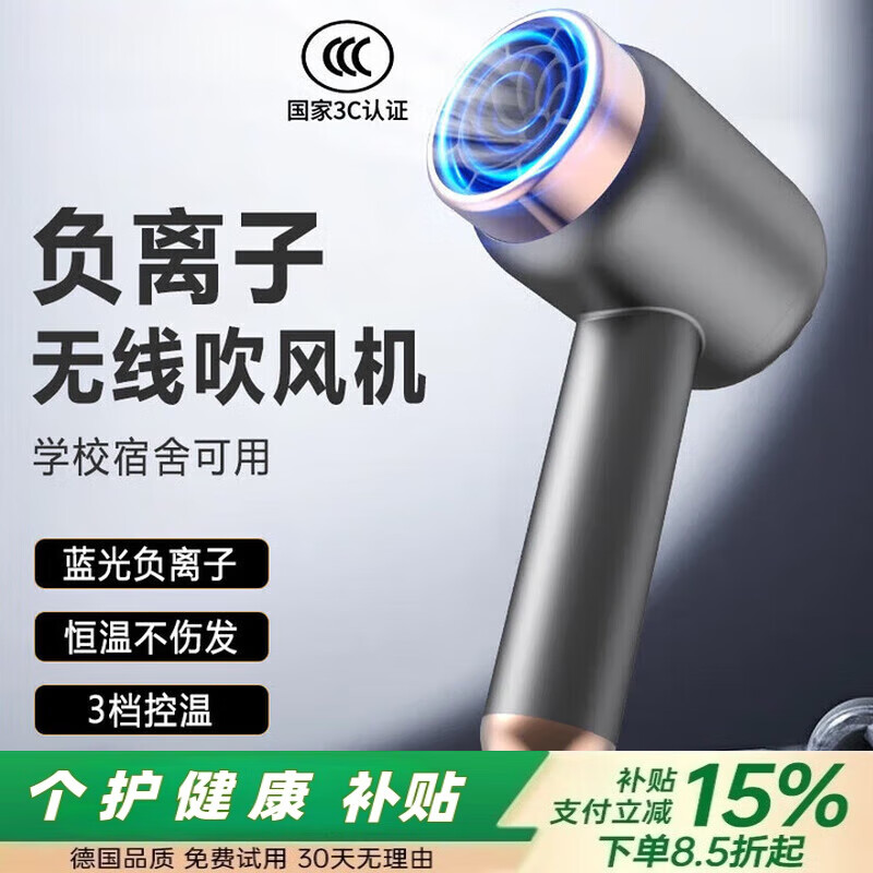戴森德乐无线吹风机小功率充电吹风筒家用便携不插电宿舍用负离子冷热发吹风机速干宿舍用送女友 [负离子款深灰]充/插两用+无线冷风 高速恒温+蓝光水润+随身携带
