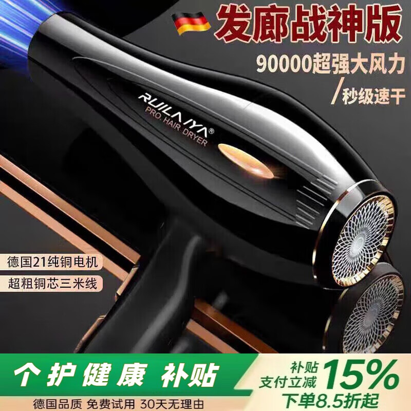 戴森德乐吹风机家用静音大功率不伤发高速电吹风发廊护发恒温蓝光负离子吹风机家用吹风筒 【高亮黑】 强力高配发廊家用 大功率速干+低音降噪+过热保护