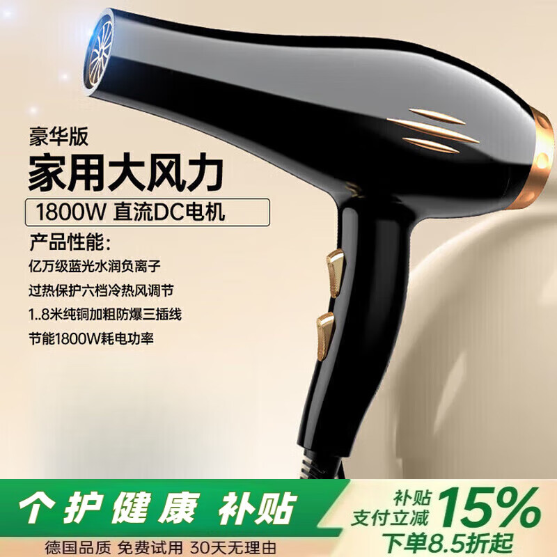 戴森德乐理发店电吹风机家用负离子护发大风力发型师专用大功率速干冷热风 尊耀黑-【1800W]家用标准版【大风力1.8】 蓝光水润负离子+过热保护