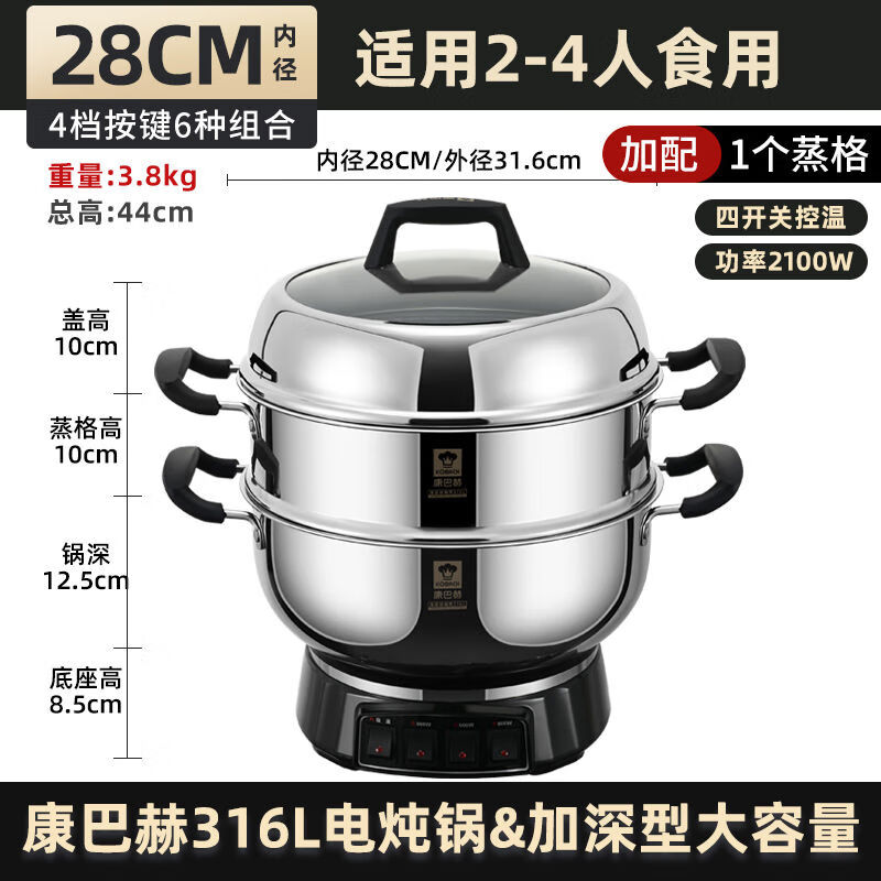 康巴赫316L不锈钢电炒锅多功能料理锅煮炒煎一体家用炒锅电蒸锅 28cm带蒸笼1代316L不锈钢