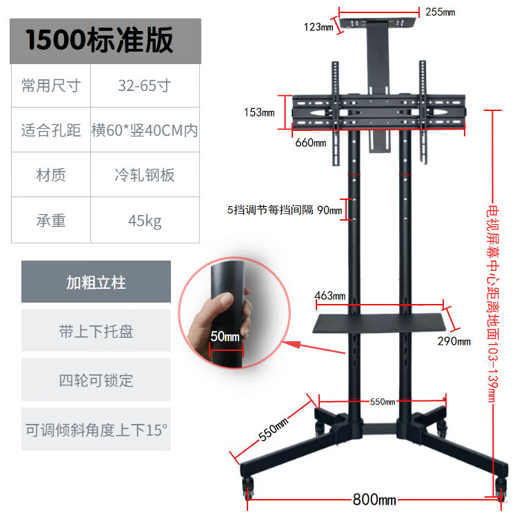 双幼移动支架55-120寸万向轮防倾倒教学会议直播一体机冷轧钢落地推车 1500标准版32-65寸