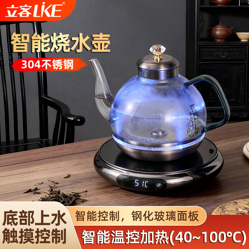 立客(LIKE)全自动上水电热水壶加厚高硼硅玻璃304不锈钢发热盘煮开水壶带蓝光灯 1L 底部上水侧把壶LK-C32