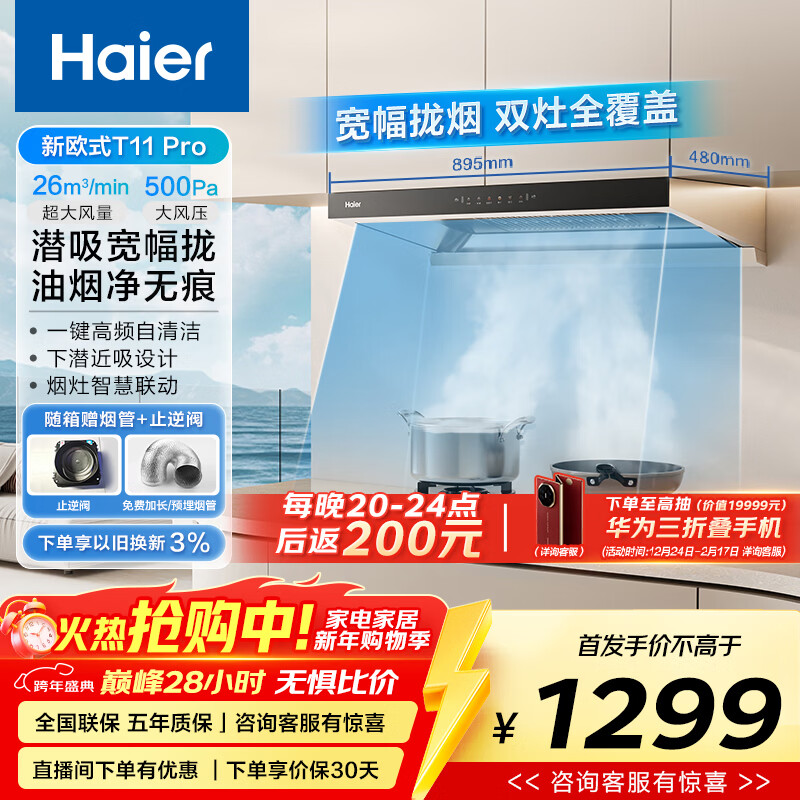 海尔(Haier)抽吸排油烟机 家用欧式顶吸下潜 免费上门安装26风量大吸力 自清洁可烟灶联动T11Pro【首发抢8折】
