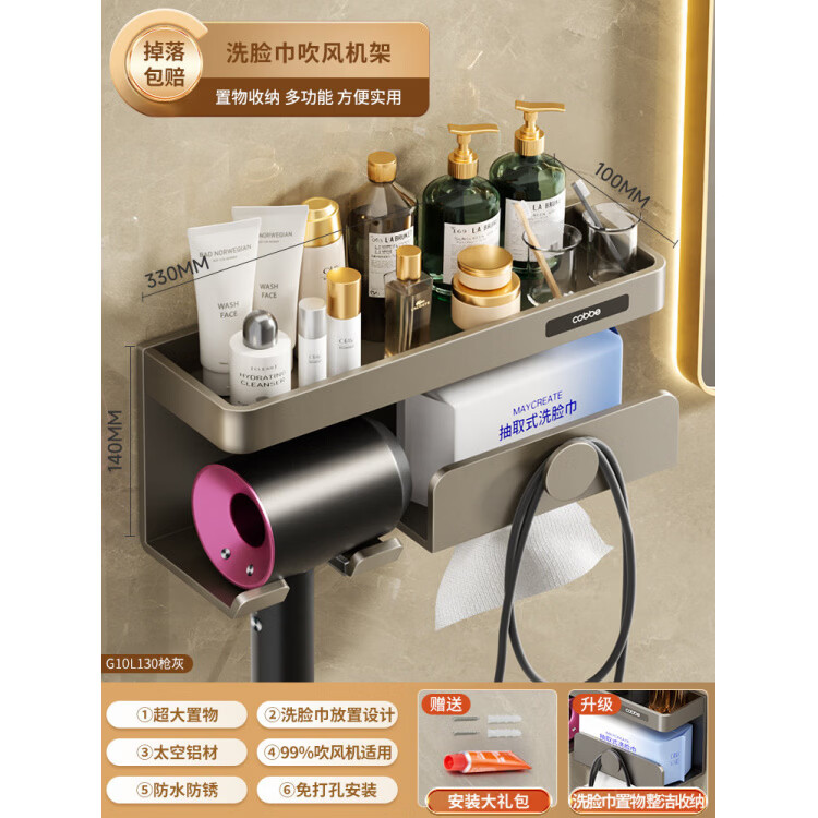 卡贝(cobbe)吹风机置物架免打孔壁挂式浴室架子电吹风支架卫生间收纳神器 枪灰吹风机架+大置物+洗脸巾架
