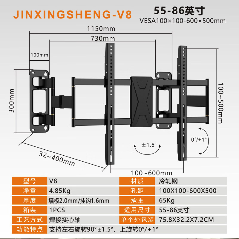 双幼升级超薄伸缩大屏电视挂架适用雷鸟海信华为索尼55-120寸通用 【特厚加强款】55-86英寸电视用