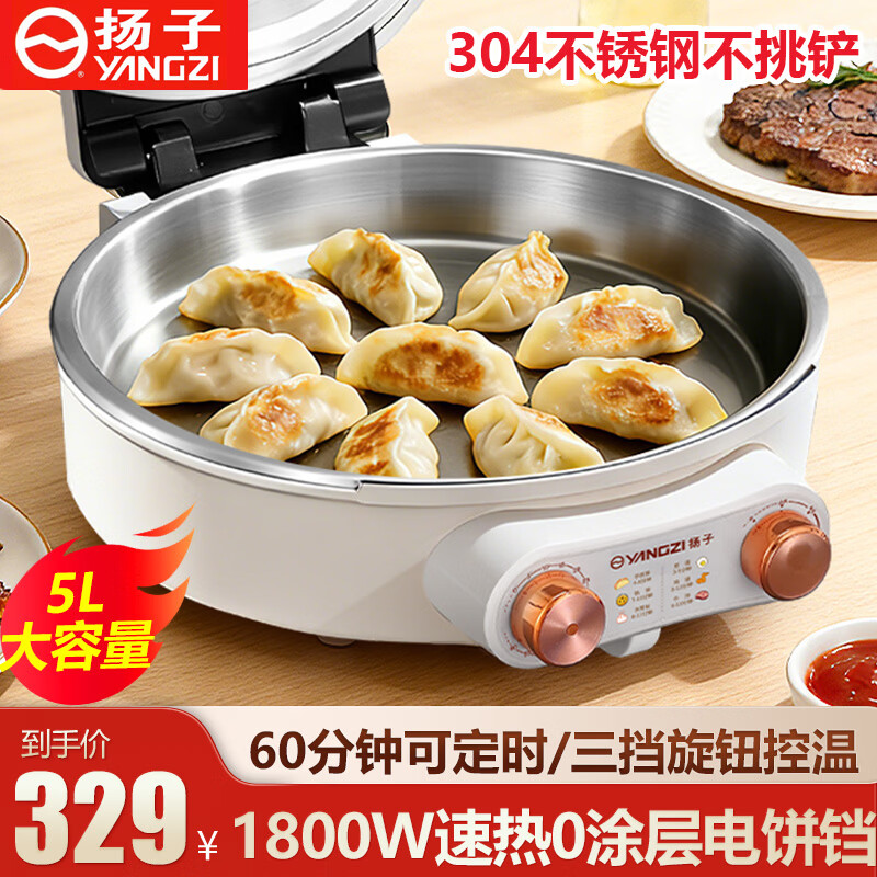 扬子(YANGZI)电饼铛304不锈钢无涂层家庭用1800W双面加热加大加深5.2烙饼专用锅可控温电饼档煎饼电煎锅早餐机 三档调温 【34cm 5.2cm深】+可定时