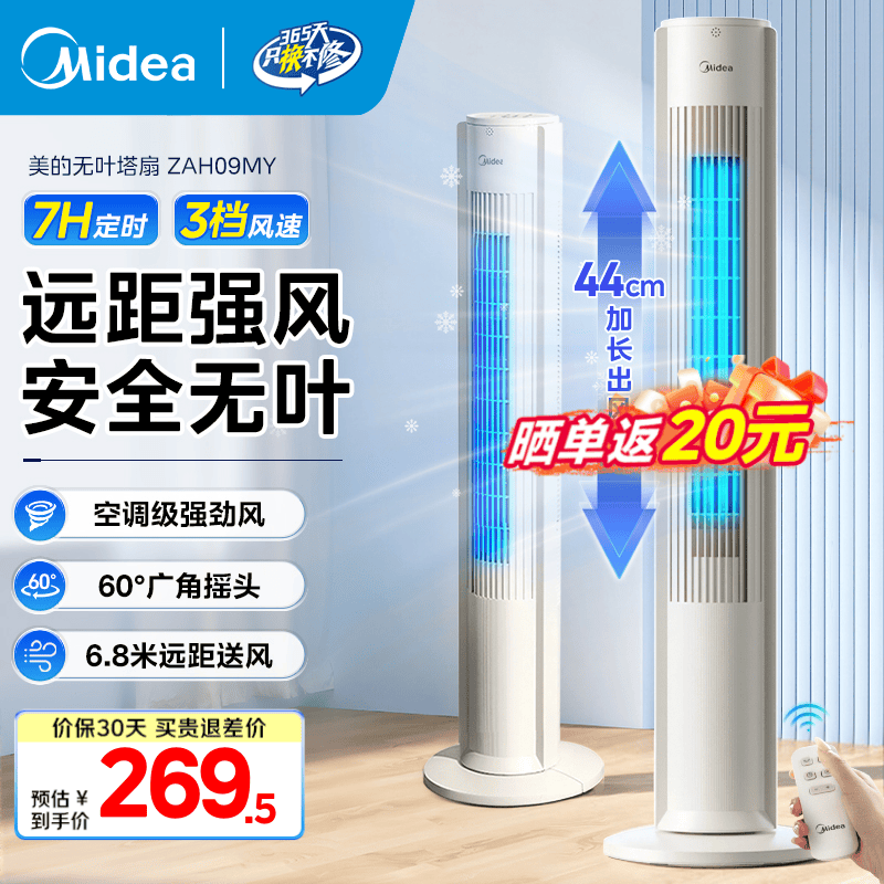 美的(Midea)立式落地塔扇 电风扇家用风扇立式无叶落地扇 智能摇头轻音节能降温柔风轻音自然风电扇 遥控款丨空调级大风力