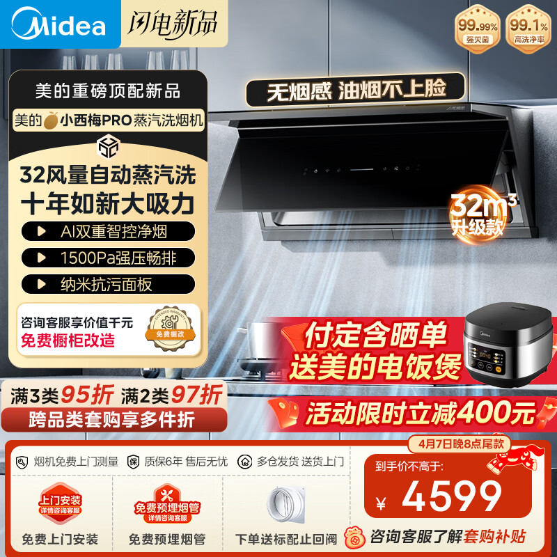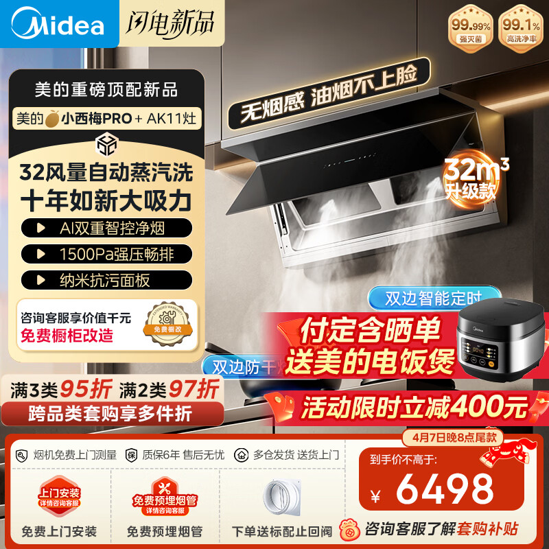 美的(Midea)【小西梅PRO升级版】抽油烟机家用 32风量顶侧一体双风道1500Pa变频大静压自动高温蒸汽洗灶具套装 【小西梅PRO主推套装】32立方+5.2双边防干烧定时AK11