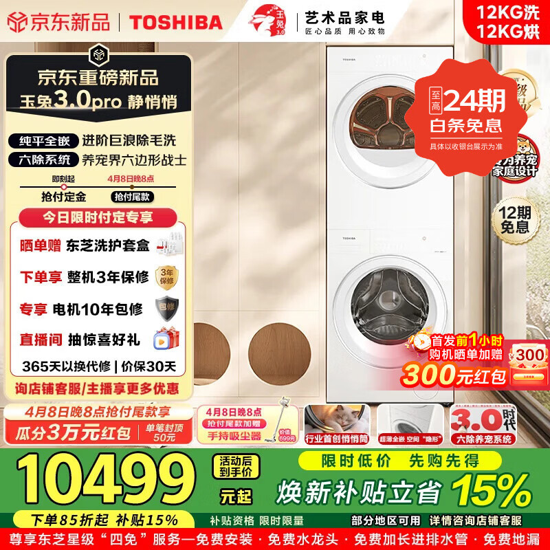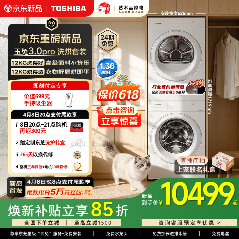 东芝【官旗】玉兔3.0pro洗烘套装悄悄筒全自动洗衣机变频热泵式烘干机滚筒纯平全嵌12KG玉兔2.0升级款 【重磅新品】行业首创悄悄筒系列 洗烘套装