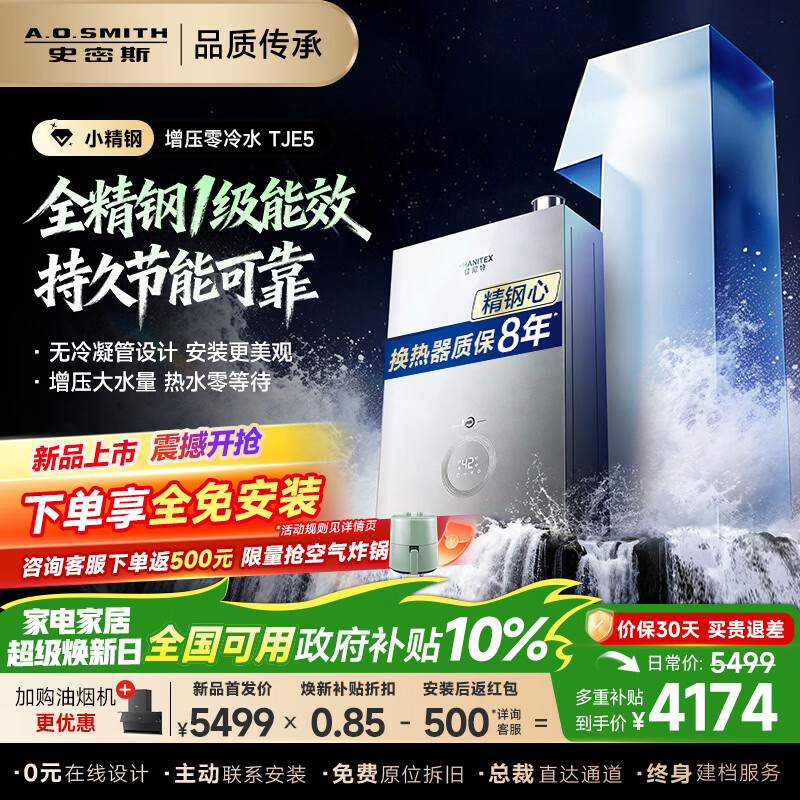 史密斯(A.O.SMITH)佳尼特 全精钢心燃气热水器 一级能效零冷水 【无冷凝水管】JSLQ28-TJE5增压大水量16升 年度新品 16L 【一级能效新品】无冷凝水管
