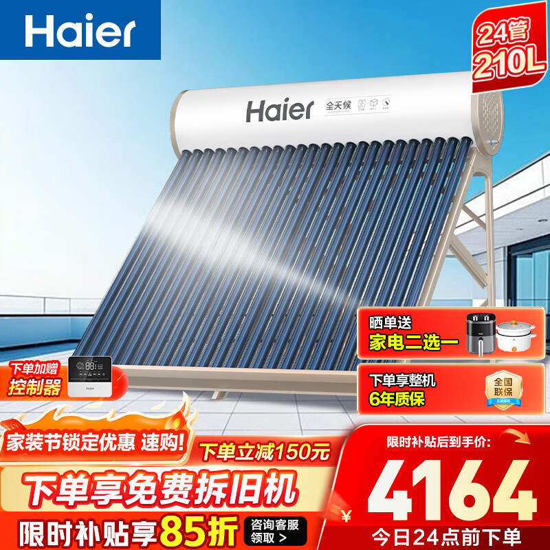 海尔(Haier)J7太阳能热水器家用175升一级能效自动定时上水 热水全天候WIFI电辅加热水箱升级 24管210升【适合4-6人】