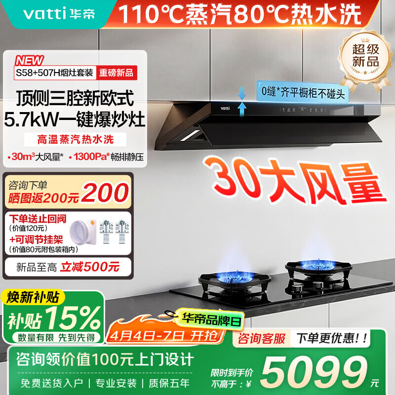 华帝(VATTI)i11S58【京翼小飞碟】烟灶套装 欧式顶侧一体超薄平嵌变频家用30风量大吸力蒸汽热水洗油烟机 【一键爆炒灶套装】S58+507H
