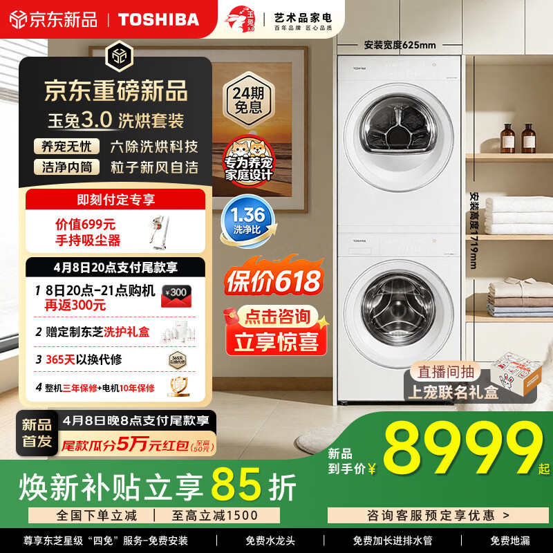 东芝【官旗】玉兔3.0洗烘套装全自动洗衣机变频热泵式烘干机滚筒纯平全嵌10kg一级能效补贴玉兔2.0升级