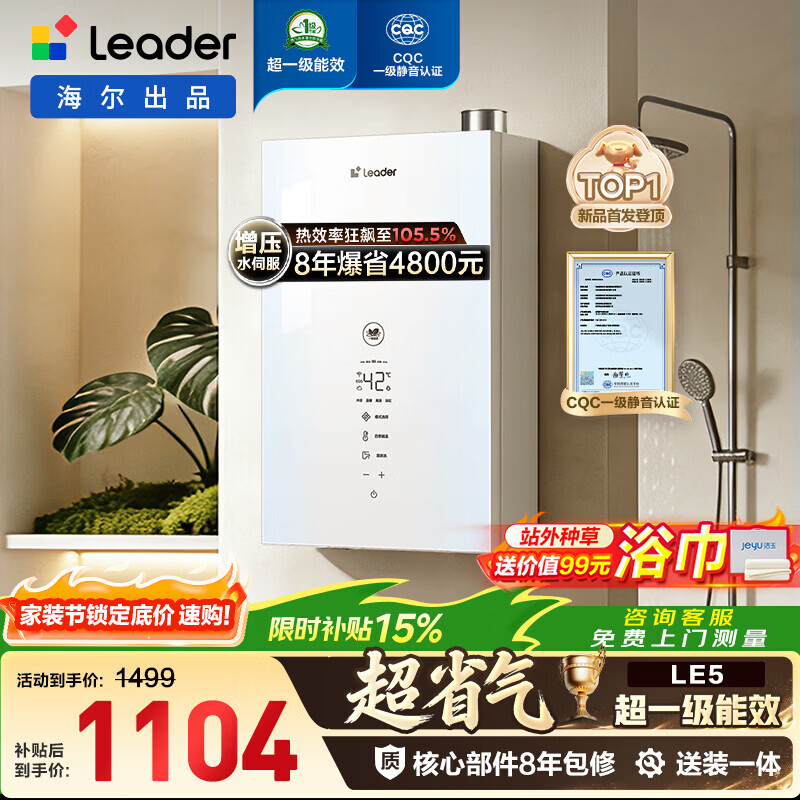 海尔出品Leader统帅超一级能效LE5ULTRA增压一级静音零冷水燃气热水器天然气16升节能恒温wifi智控 16L LE5【一级能效静音】