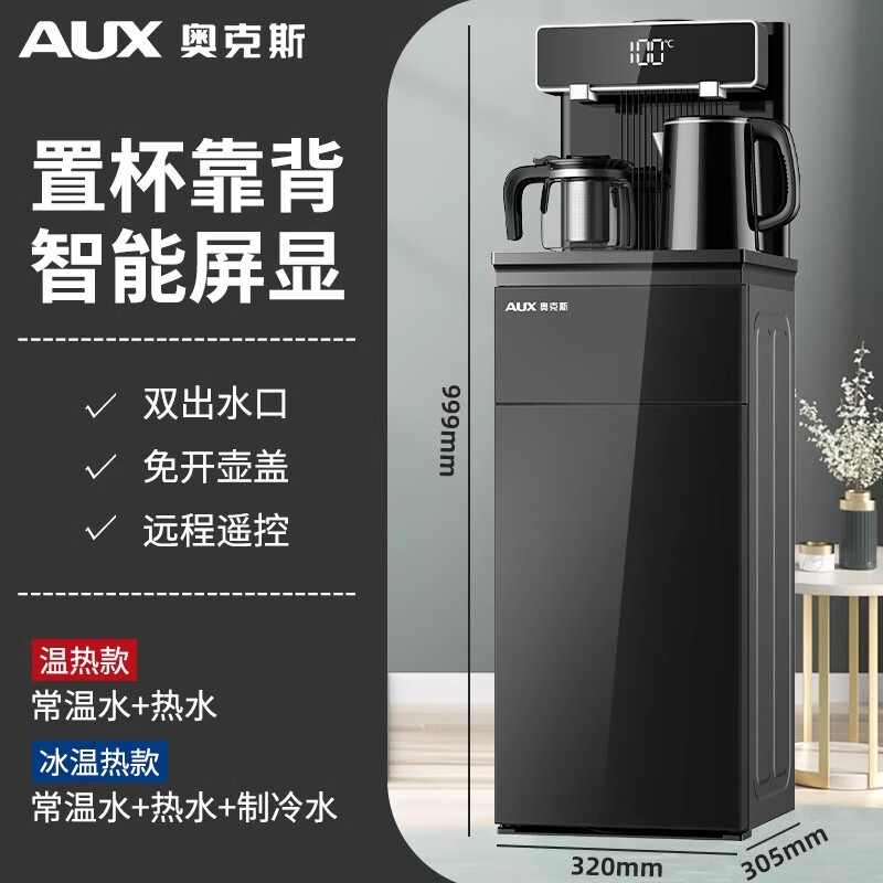 奥克斯(AUX)立式智能饮水机家用下置水桶冷热多功能全自动桶装水茶吧机 【置杯靠背】-黑色+双出水口+遥控+显 即热制冷型 温热