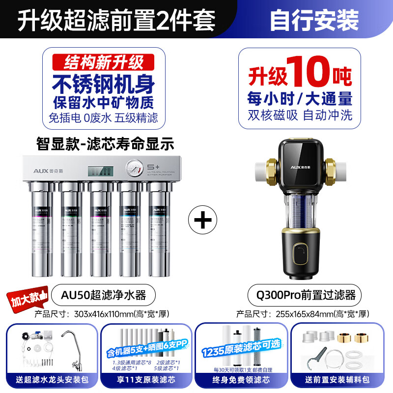 奥克斯(AUX)净水器直饮家用厨房自来水超滤净化商用前置过滤厨下饮水机 智显款-超滤前置套装-自行安装 【套餐 即热制冷型