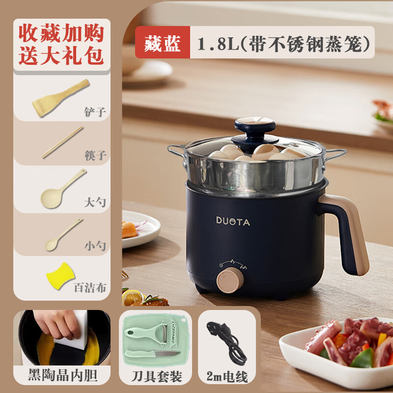 电煮锅多功能迷你单人火锅泡面锅学生宿舍家用小电锅 藏蓝1.8L+不锈钢蒸笼+刀具+2m电线【黑陶晶内