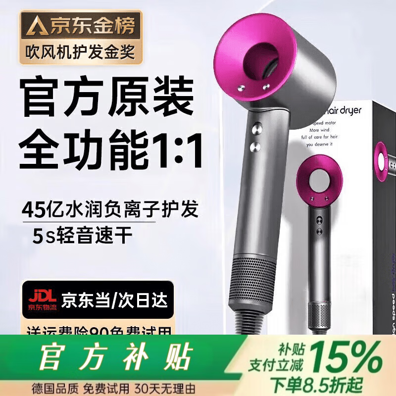 戴森德乐【3C认证华强北顶配1:1】无叶高速吹风机家用静音大功率不伤发恒 2025年新款[玫红色]45亿负离子丨