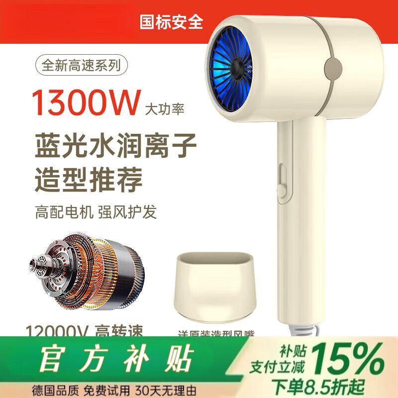 戴森德乐吹风机风力负离子速干家用学生宿舍电吹风冷热大功率护发 5亿负离子1300W送风嘴奶