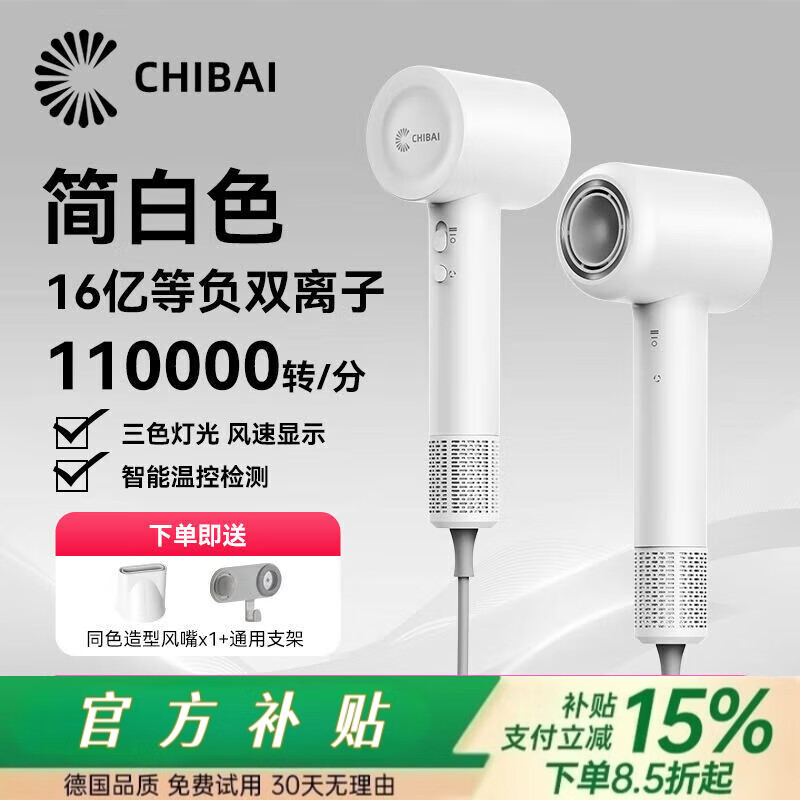 戴森德乐【商场同款高速吹风机家用负离子护发静音大风力速干大功率 浅白色 [CHIBAI礼盒版]磁吸双用支架+