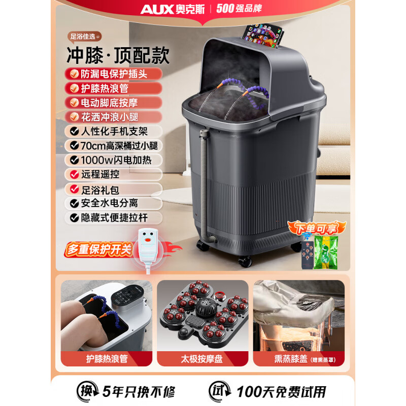 奥克斯(AUX)泡脚桶加热恒温自动洗脚家用电动按摩足浴盆高深过小腿膝盖 【70CM漏保膝盖冲浪款】_线+电动按摩+漏保插头